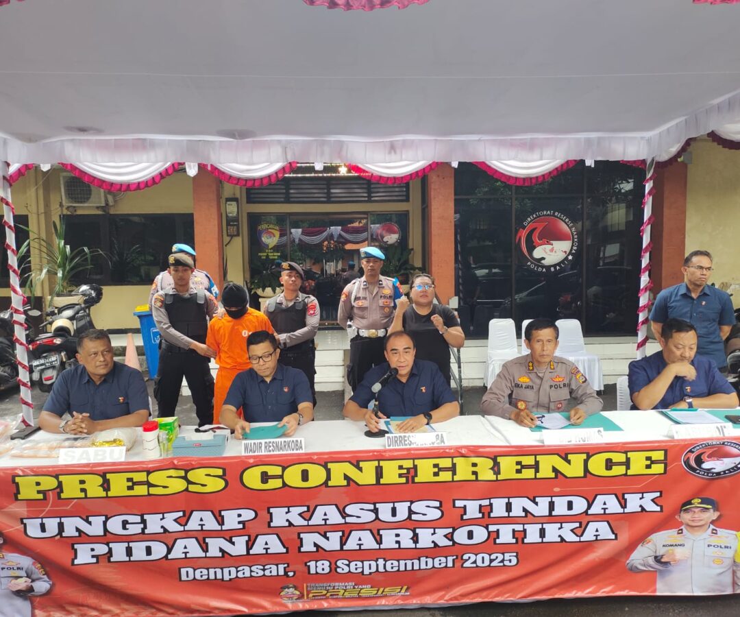 Bali – Dpost.com ! Konfrensi Pers didepan para awak media Dirresnarkoba Kombes Pol Radiant S.I.K., M.Hum., didampingi Wadir dan para Kasubdit, serta Kasubid Penmas Bidhumas, menerangkan Polda Bali mengamankan seorang pemuda asal tabanan, kamis 18/9/2025.